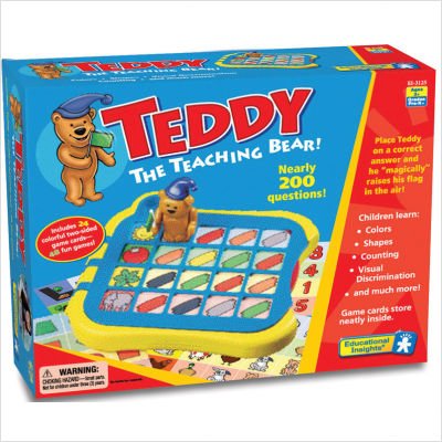 3125 Young children learn colors, shapes, visual discrimination, alike and different, go - togethers, counting, and much more with Teddy, the teaching bear. The charming bear ''tutor'' comes with 24 two - sided game cards (48 games) that fit on the sturdy Activity Pad. Just place a card on the Activity Pad, and turn the color - coded dial to match the card. Look at the question, then place Teddy on an answer square. Features: -Teddy. -Teddy lifts his flag high in the air. -Nearly 200 questions, no reading required. -Cards store neatly inside Teddy's Activity Pad. -Grades: Pre K up. -Age: 3 years up. -Dimensions: 16.6'' H x 10.7'' W x 16.7'' D.[endif][if ]Educational Insights Teddy Specifications